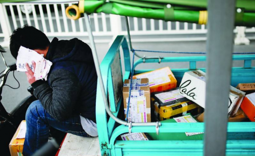 他不知道自己一天送了多少個快件,中關村寫字樓里的人上班,他開始工作,寫字樓里的人下班,他還在工作。
