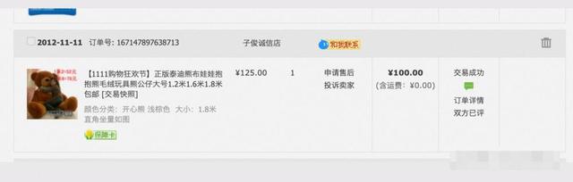 網友丁表示,2012年和女友異地戀,那年“雙11”買了一個真人大小的玩具熊,讓玩具熊去陪伴女友。 “現在我們女兒都要上小學了,“雙11”看了下之前那個賣小熊的店還在,已經是天貓店了,價格居然也沒有變,果斷下單。”