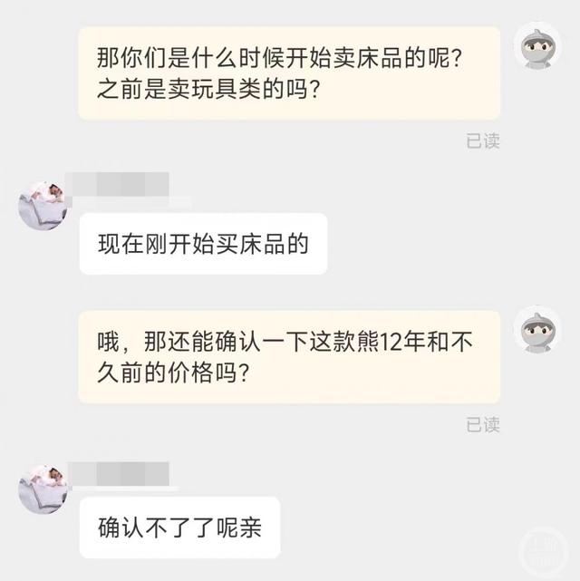 記者聯系的另幾家店鋪客服也表示,無法查詢到10年前的商品信息。如網友丁提到售賣玩具抱熊的商家,在近期剛剛轉型為賣床品,記者詢問其過去是否賣過玩具熊,客服回答道:“確認不了”“好久了呢”。