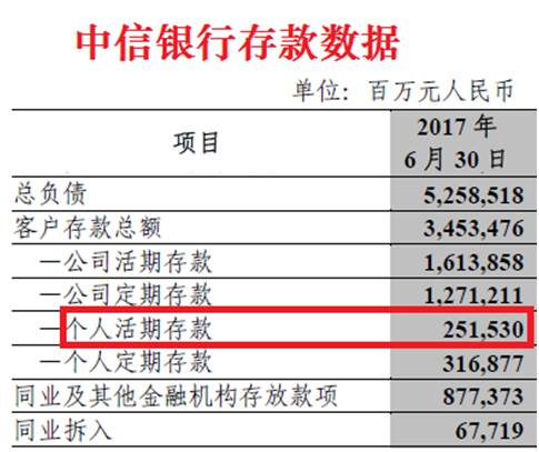 其次是中信銀行的數據,該銀行主要存款來自于公司客戶,2017年6月30日的個人活期存款余額為2515億元。