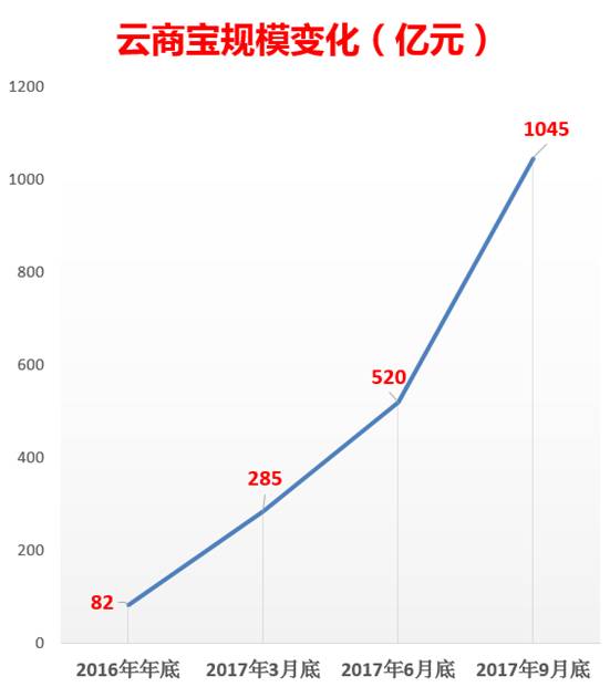 然而,馬云旗下的另一個寶寶卻快速增長,云商寶的規模從2017年6月底的520億元,大幅提升到了9月底的1045億元,短短一個季度環比增加了100%以上,比去年年底的82億元更是增加了近12倍之多,成為天弘基金公司資產規模增長的新動力。