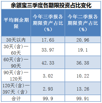 基金三季報數據還顯示,報告期末余額寶投資組合平均剩余期限為60天,這一數據比今年中報數據再度減少12天。