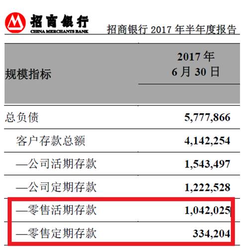 首先看看招行的數據,2017年6月30日的個人(零售)活期存款余額為10420億元,環比2016年年底的9516億元,增加了900多億元。