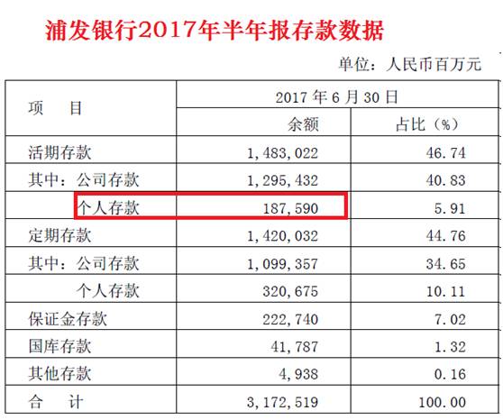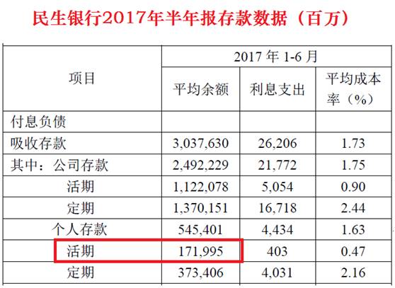 浦發銀行和民生銀行的個人活期存款更少一些,2017年6月30日的浦發銀行個人活期存款余額為1876億元,民生銀行沒有披露2017年6月30日當天的存款余額,只披露了2017年1月到6月的個人活期存款平均余額為1720億元。