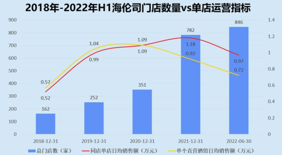 下滑的翻臺率需要用更高的客單價來彌補,但海倫司單店銷售業績正在下滑。數據顯示,海倫司同店單店日均銷售額已由2020年的1.09萬元,降至今年上半年的9700元,而單個直營酒館的日均銷售額也呈現出同樣的趨勢,從1.09萬元下滑至7200元。