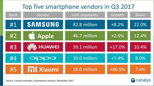 現在,市場調研機構Canalys給出了今年第三季度的智能手機市場的數據,其中三星依然穩坐老大位置,緊隨其后的分別是蘋果、華為、OPPO和小米。
