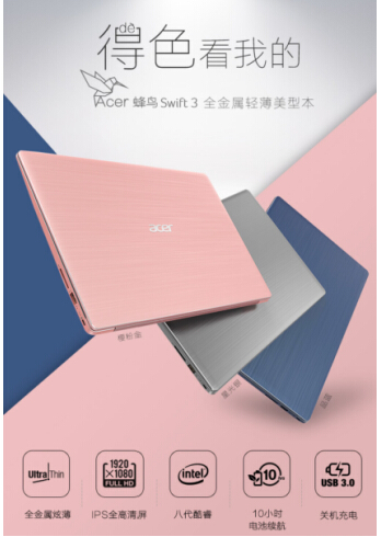 要向大家介紹的是號稱時尚達人標配的炫彩蜂鳥Swift 3系列輕薄本。配備多款時尚炫色的蜂鳥Swift3擁有著僅17.95mm的纖薄“身材”,外殼為全金屬鋁合金機身,采用金屬拉絲表面處理工藝和邊緣斜切設計。“銀騎士”、“粉小樣”、“藍朋友”如此俏皮的別稱,分別對應星光銀、櫻粉金、品藍三款主打俏色外觀,一觸心動的炫薄之美盡在其中。秀其外還要慧其中:蜂鳥Swift3搭載了今年8月才發布的最新第八代智能英特爾酷睿處理器,這款最新銳的中央處理器從雙核擴展到四核,其綜合性能較上一代大幅度提升40%,并且相比 5年前的電腦,系統性能最高提升2倍,圖形性能最高提升2.5倍。配合DDR4高速內存及目前最先進的SSD,蜂鳥Swift 3能實現秒速開機,處理多個任務流暢而高效,無卡頓之憂,出色的表現足以征服每一位挑剔的用戶。