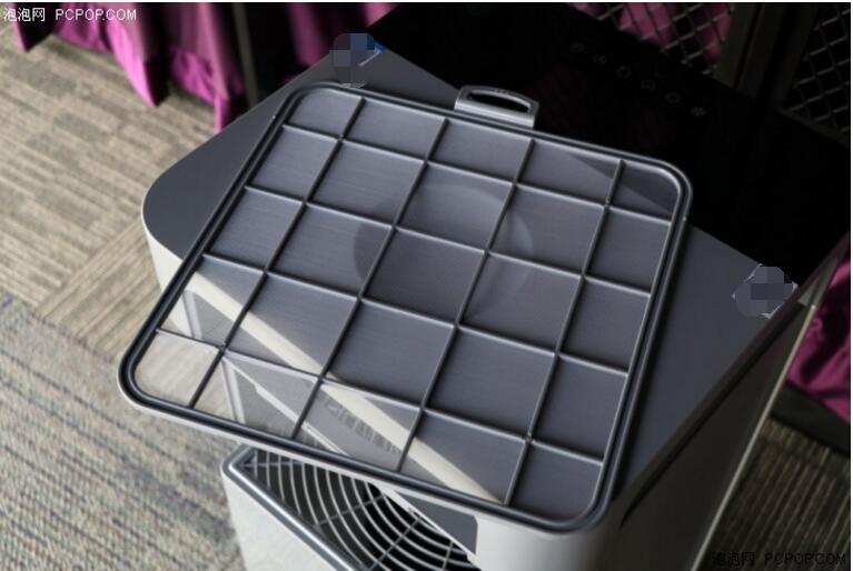↑ 下方的進風口可以直接看到大面積的中效HEPA濾網,但其實在HEPA之前還有一層紗網初濾,用于隔絕塵土毛發等大顆?;覊m。