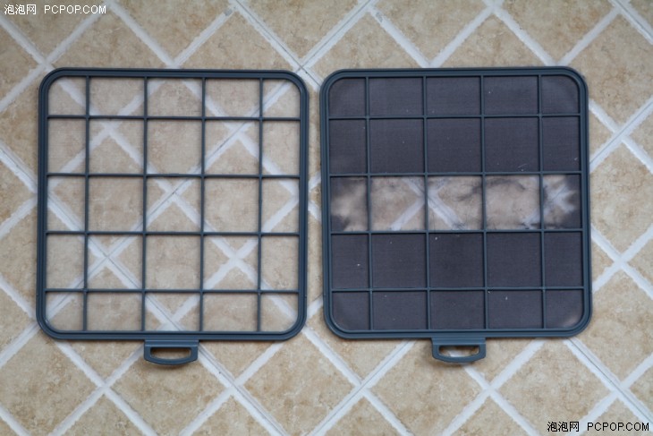 ↑ 右側是長時間未清理的初效濾網,已經被灰塵糊滿,這樣會嚴重影響凈化器的進風,導致凈化效率降低。比如在北京這樣灰塵比較大的北方城市,至少應該保證1個月的時間清理一次初效濾網。
