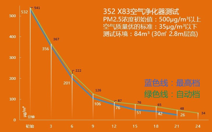 在PM2.5初始濃度532μg/m時,使用352 X83的最高檔持續凈化,用了10分鐘就將污染濃度降到了100μg/m以下,最終在21分鐘時,達到26μg/m的空氣質量優水平。如果使用自動檔,初始濃度接近的情況下,352 X83一直維持高檔位工作,同樣在10分鐘左右將PM2.5濃度降低至100μg/m以下,此時開始機器調低檔位工作,最終在24分鐘時達到34μg/m的空氣質量優的水準。按此表現來看,我認為352 X83的凈化能力是相當不錯的。